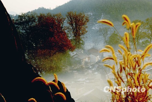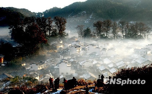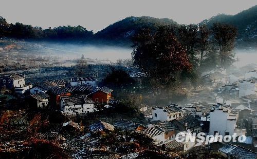 12月29日早晨拍摄的烟雾弥漫的江西省婺源石城。雪后初晴,江西省婺源县石城村粉墙黛瓦的古民居在烟雾中若隐若现,与千年红枫林交相辉映,宛如一幅绝妙的水墨画。